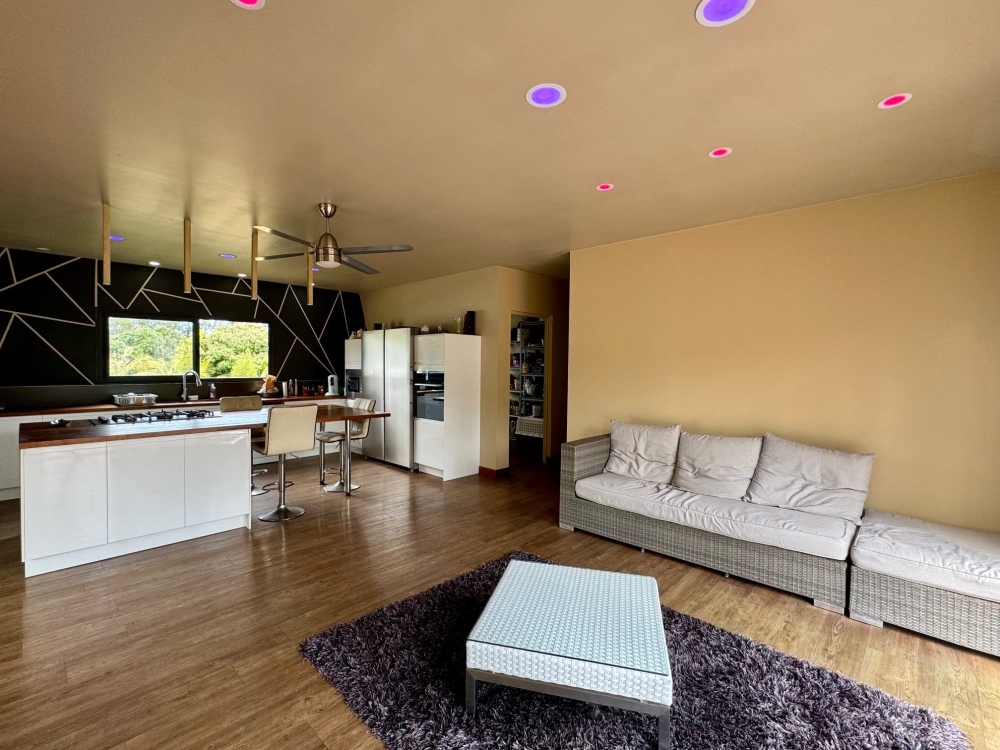 En partie jour, vous disposerez d'une très belle cuisine ouverte, meublée et équipée (plaque à gaz, hotte, four, microonde intégré, ilot central, lave vaisselle), d'une buanderie / garde manger de 4.94m², le tout donnant sur un beau séjour très lumineux de 37.27m² avec un accès sur la terrasse et le jardin, au calme sans vis à vis.