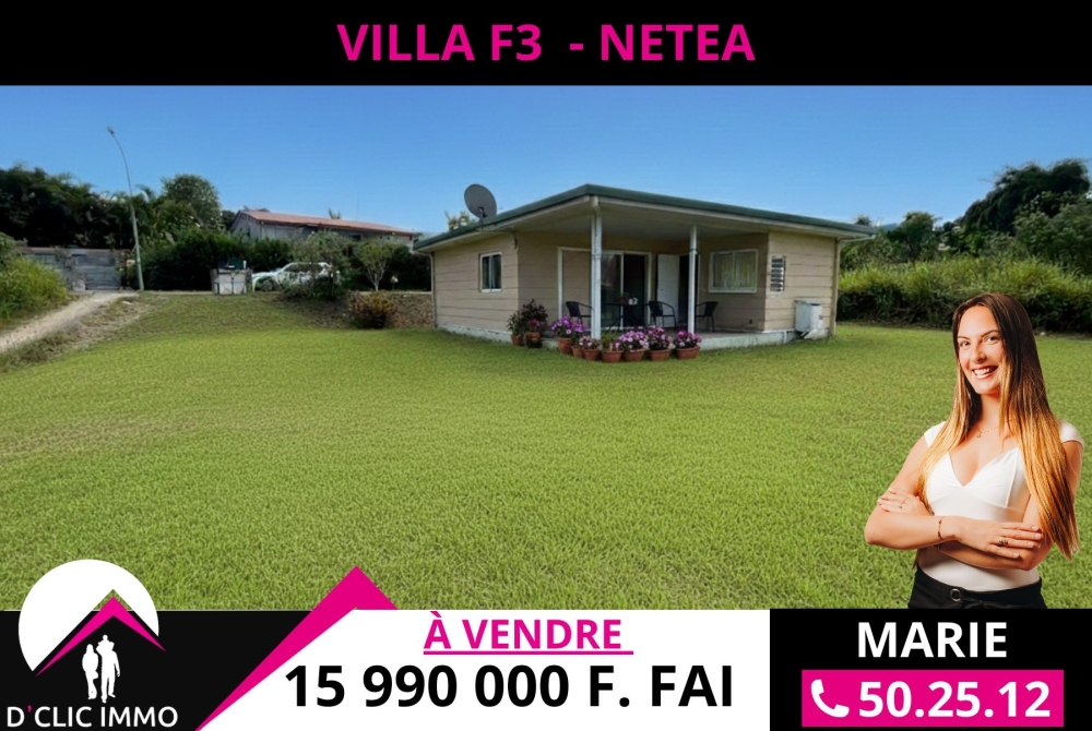 Située dans le quartier résidentiel et familial de Nétéa, l'agence D'CLIC IMMO vous propose une villa récente datant de 2018, de type F3 en clin, de 57.53m² habitable + 16m² de terrasse couverte sur un beau terrain plat de 5.24 ares.