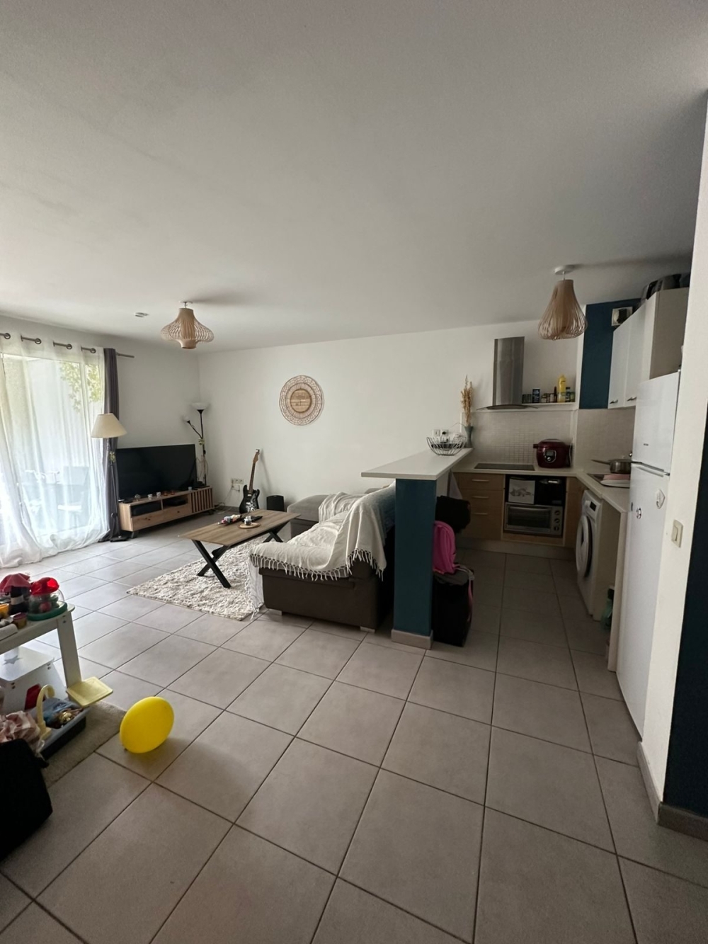 Cet appartement dispose d'une entrée, d'un cellier, d'un séjour avec cuisine ouverte donnant sur une varangue, de deux chambres avec placards, d'un toilette séparé et d'une salle d'eau.