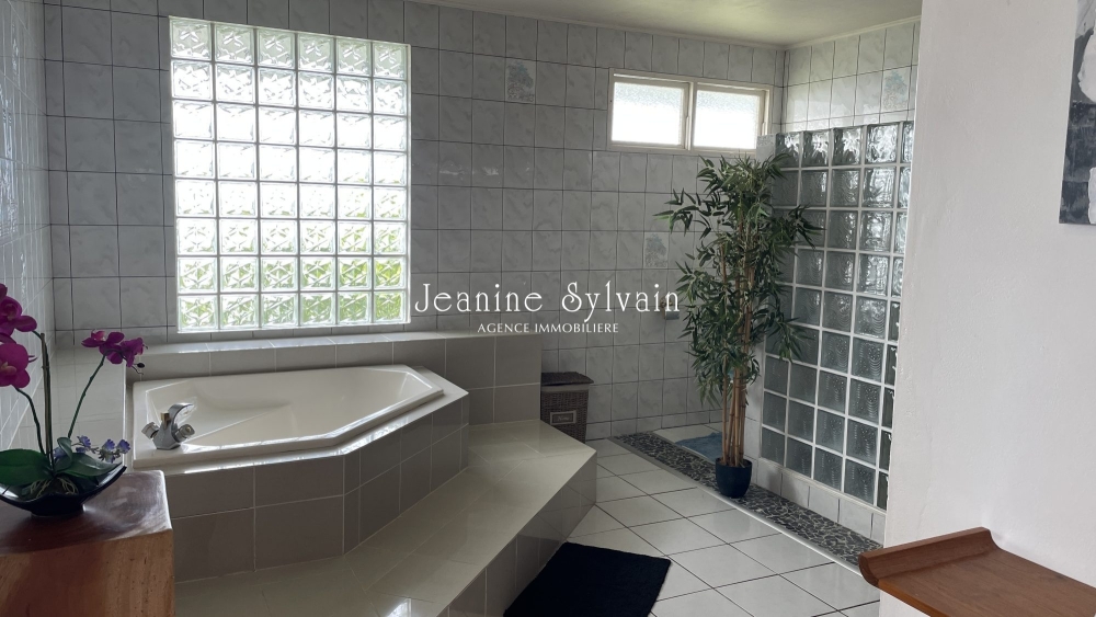 Sur les hauteurs de Supermahina, grande maison sur deux niveaux, avec jardin entretenu, piscine, belle vue dégagée sur la mer et Moorea, comprenant au RDJ séjour cuisine équipée, une terrasse couverte avec salle d'eau extérieure et à l'étage 3 chambres, 2 salles d'eau, dressing, balcon et deuxième espace jardin.