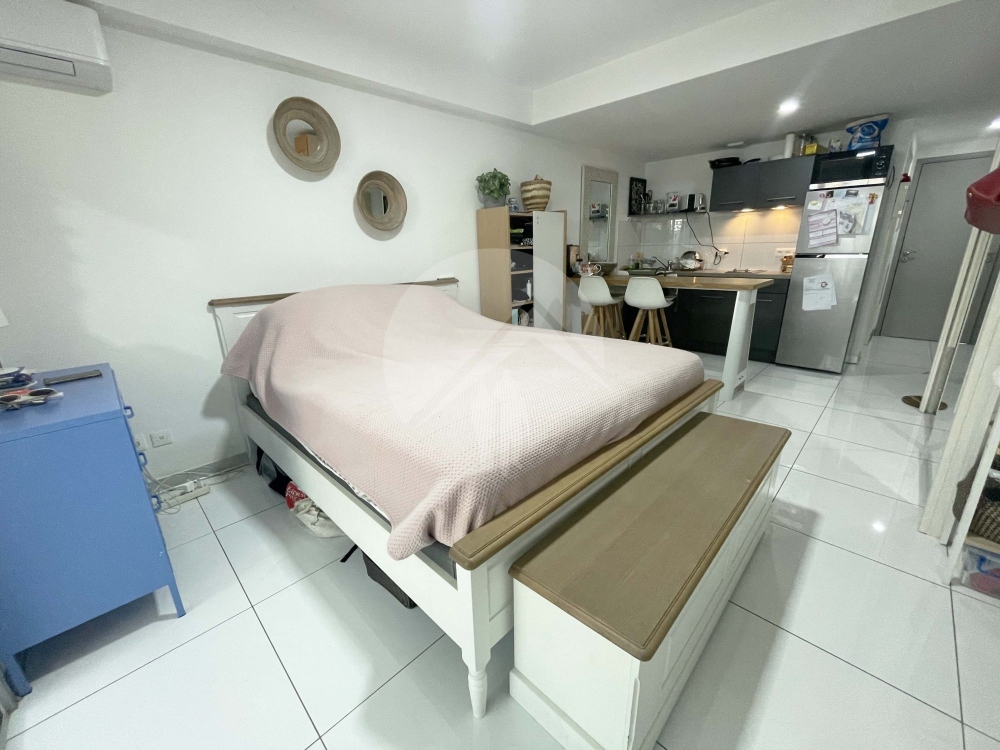 Le bien est composé d'une belle pièce principale lumineuse et climatisée de 20.79m², d'une cuisine meublée et équipée (plaque, four, hotte, rangements hauts et bas et retour de bar), donnant sur la terrasse et le jardin, sans vis à vis.