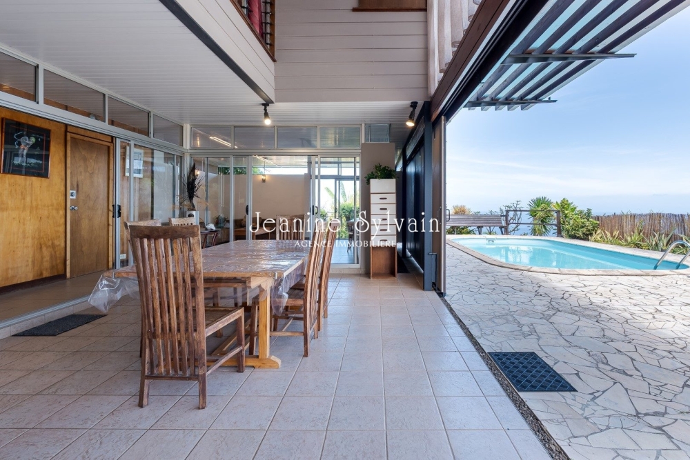 La maison est intelligemment conçue pour la vie en extérieur : le séjour principal se prolonge harmonieusement sur une grande terrasse couverte grâce à des baies vitrées entièrement escamotables. Cet espace mène directement à la piscine, créant un lieu de vie convivial et ouvert sur le panorama exceptionnel.