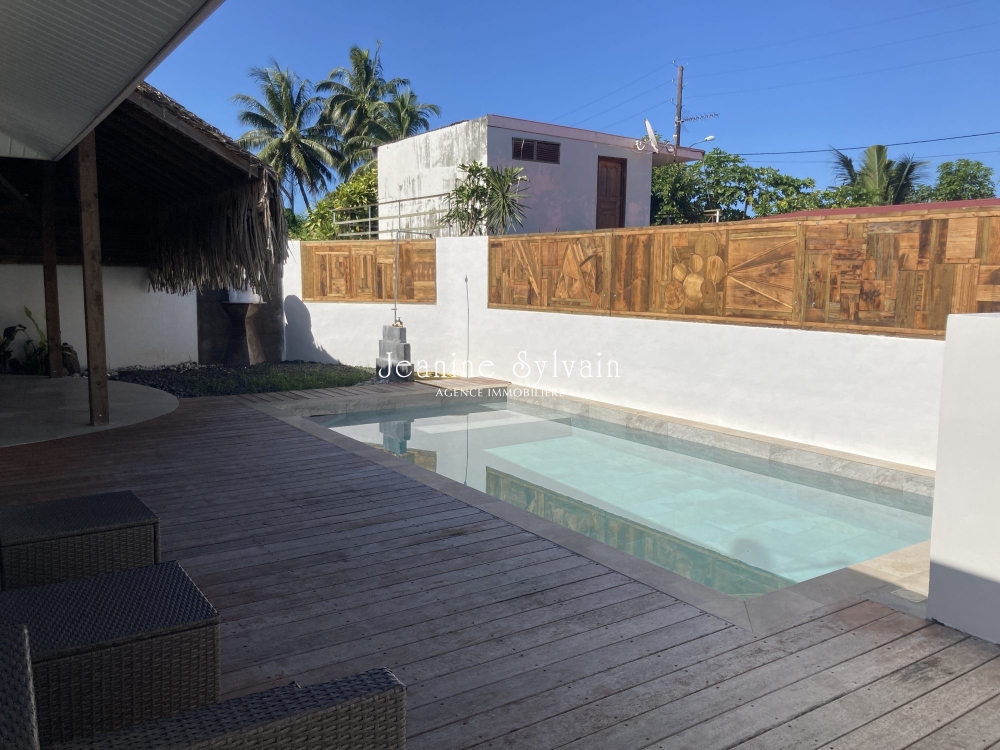 Paea, bon environnement, villa bien rénovée moderne et bien décorée, avec très grande cuisine aménagée et équipée, vaste séjour donnant sur la terrasse, fare potee, 3 chambres, 2 salles d'eau, garage couvert, jardin, piscine carrelée, entièrement clôturé avec portail manuel.