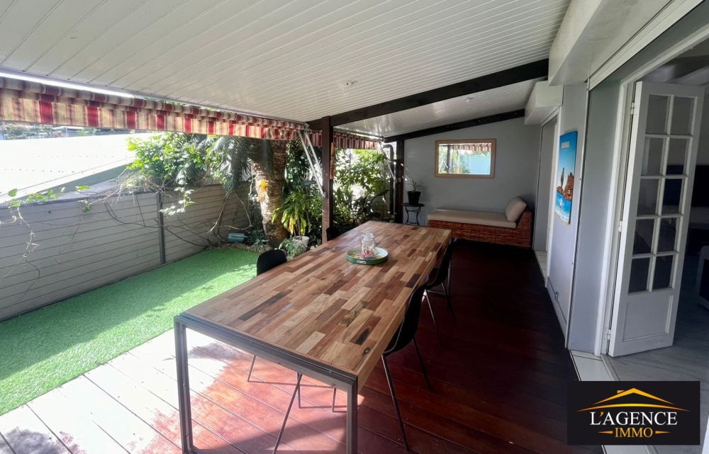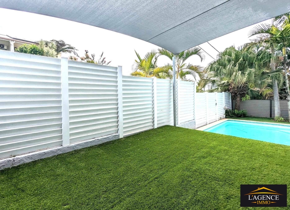 En extérieur, une grande terrasse couverte en deck donnant sur le coin jardin et une piscine avec son espace solarium.