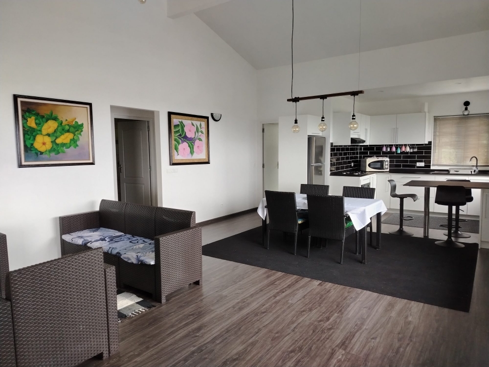 Cuisine aménagée ouverte sur une grande pièce à vivre lumineuse.