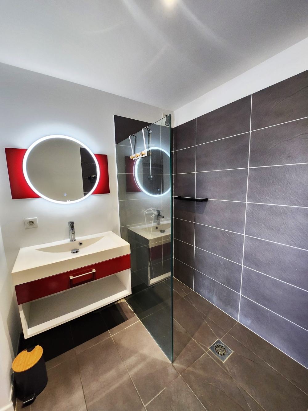 Il est composé d'une belle cuisine aménagée et équipée donnant sur un séjour, d'une chambre avec dressing et salle de bains, d'un wc indépendant et d'une terrasse de 12.20m² avec un coin buanderie.