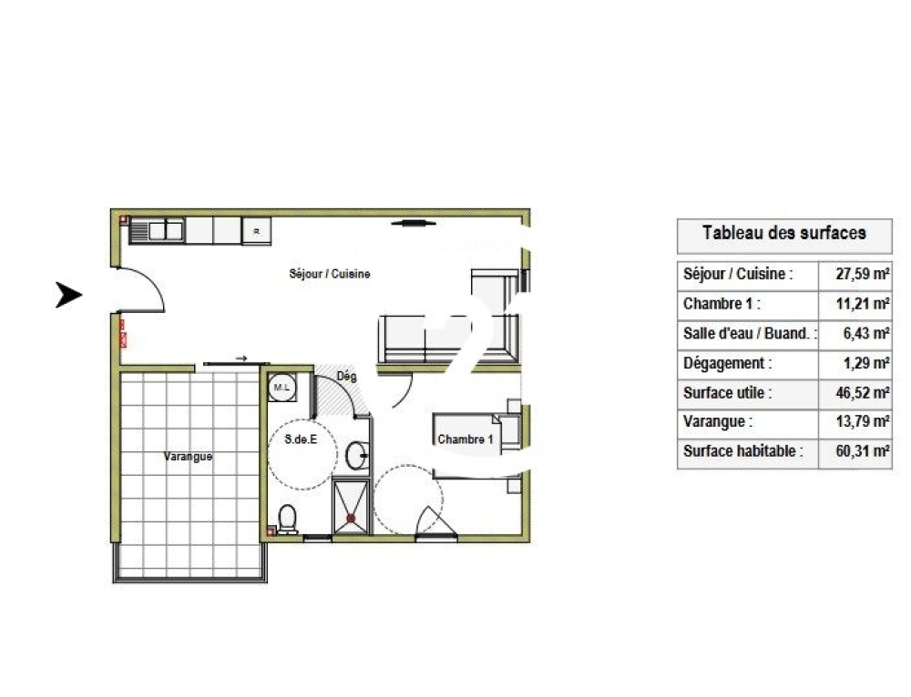 Cet appartement comporte une cuisine non équipée, un chambre et une salle d'eau avec WC. Une loggia de 13,79m² complète ce bien.