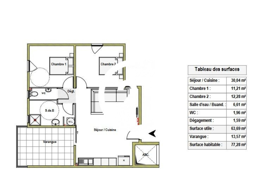Cet appartement comporte une cuisine non équipée, deux chambres et une salle d'eau avec WC. Une loggia de 13,57m² complète ce bien.
