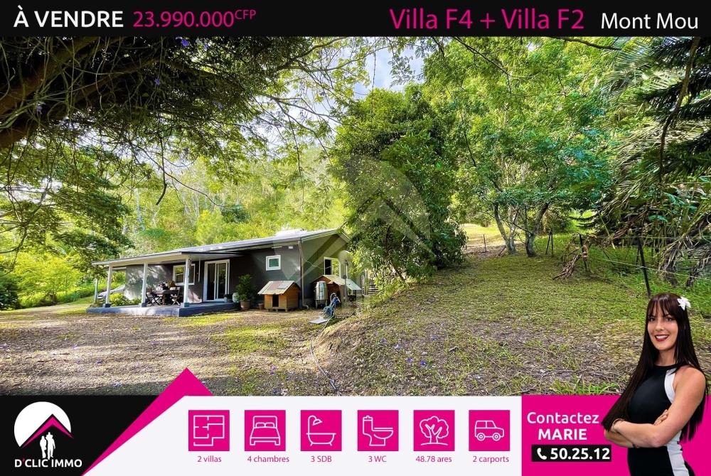 Située dans le quartier résidentiel très calme du Mont Mou à PAITA, au coeur de la verdure, l'agence D'CLIC IMMO vous propose en exclusivité une spacieuse villa de type F4 en construction fibrociment, structure métallique, toiture en tôles, datant de 2015 environ de 98m² habitable + grand bungalow de type F2 en construction bois datant de 2011 d'environ 39m² habitable, le tout sur un superbe terrain de 48.78 ares et plus de 100m² de terrasses, carport, et rangements.