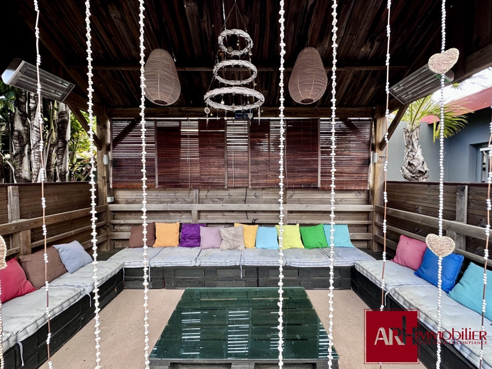 Terrasse arrière avec jardinet, coin varangue-salon d'extérieur, cuisine extérieure et bar.