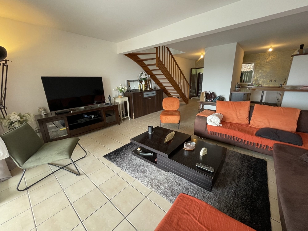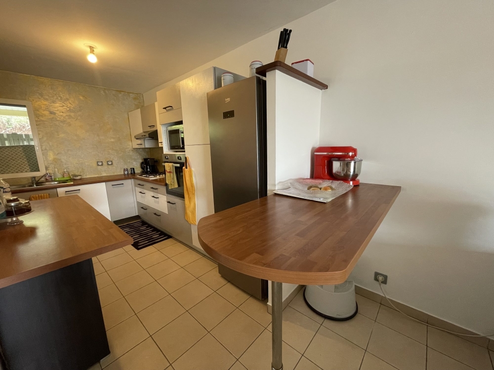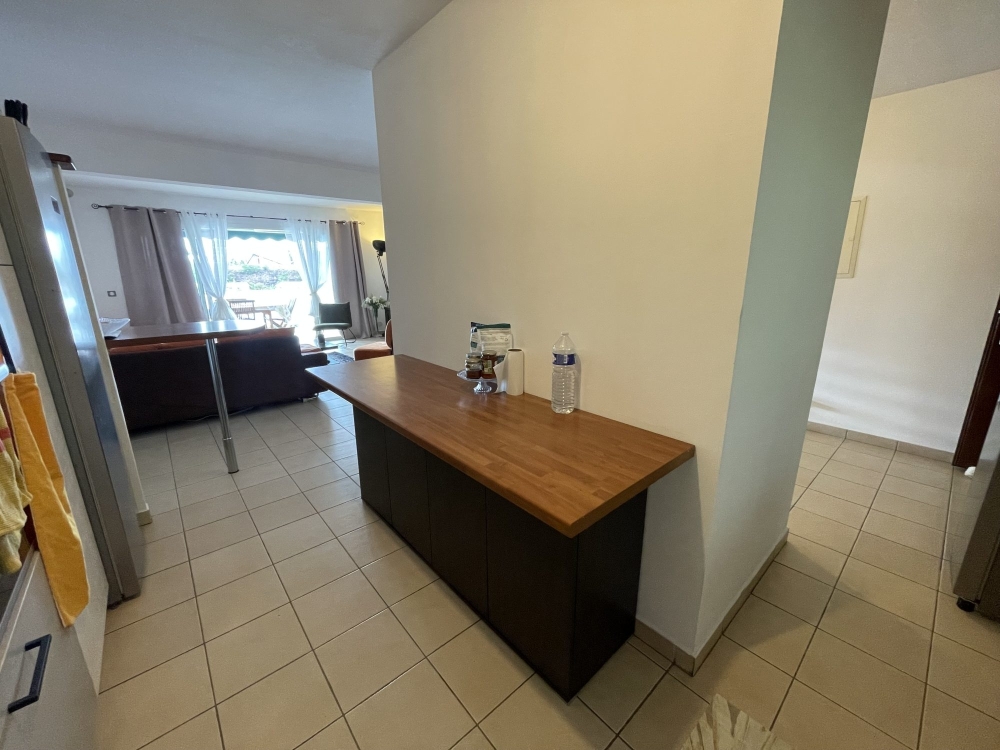 En partie jour, en rez de chaussée, vous disposerez d'une cuisine meublée et équipée (four, hotte, plaque, nombreux rangements hauts et bas) entièrement remise au gout du jour, d'un WC séparé avec lave main et d'un grand un séjour climatisé et très lumineux d'environ 46.2m², ouvert sur une belle terrasse avec une superbe vue dégagée.