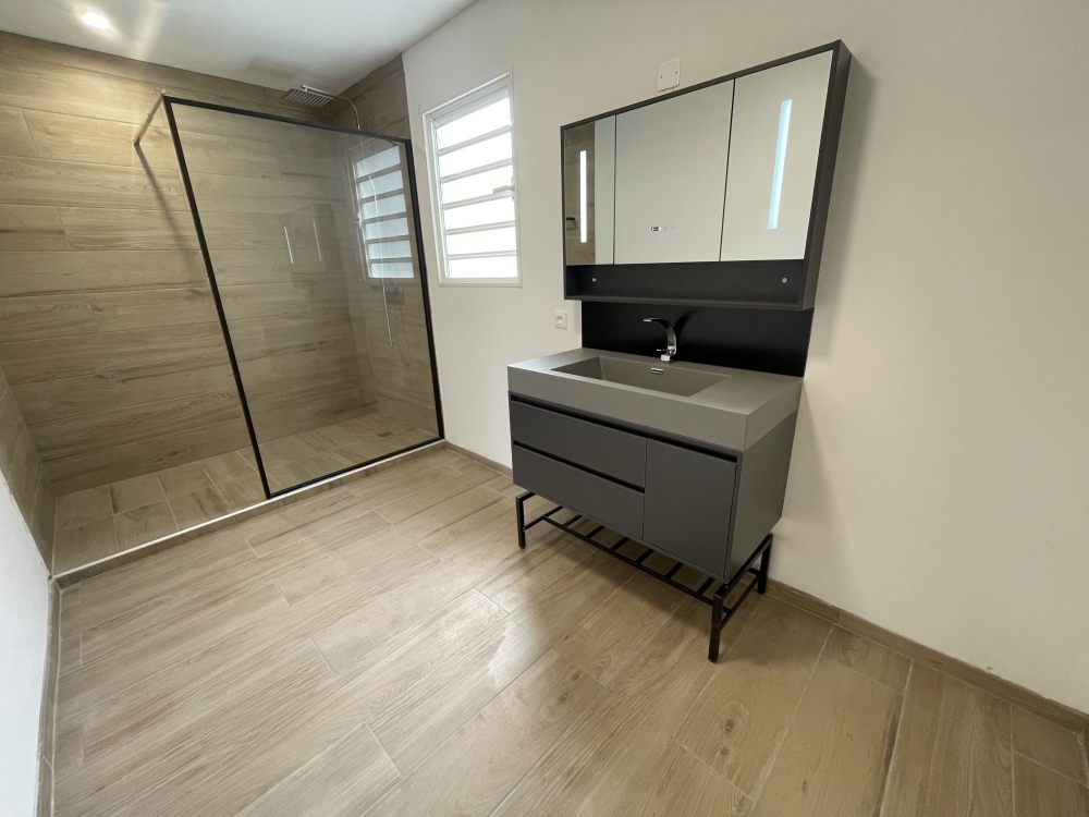 Vous disposerez partie jour d'une cuisine meublée et équipée (Plaque induction, hotte, four, ilot central, rangements hauts et bas) donnant sur un beau séjour climatisé et sécurisé par des volets roulants électriques, accès terrasse et jardin, sans vis à vis, de 45m².
