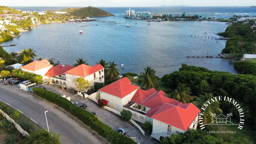 Oyster pond, dans une résidence sécurisée vente d'un appartement avec vue sur lagon, un salon séjour avec cuisine américaine, une grande terrasse couverte, chambre séparée