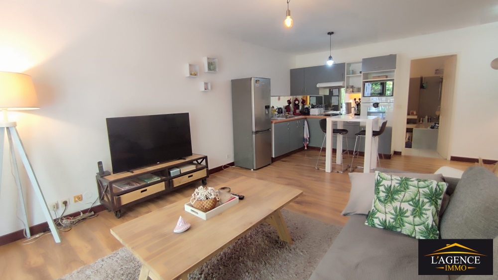 Ce spacieux F2 de 49 m² comprend une entrée, un séjour avec cuisine équipée, une grande chambre avec placards, une salle de bain et sanitaire, prolongée d'une buanderie. Un espace pouvant servir de bureau. Une terrasse couverte de 18 m² offre une vue agréable dans un cadre végétal.