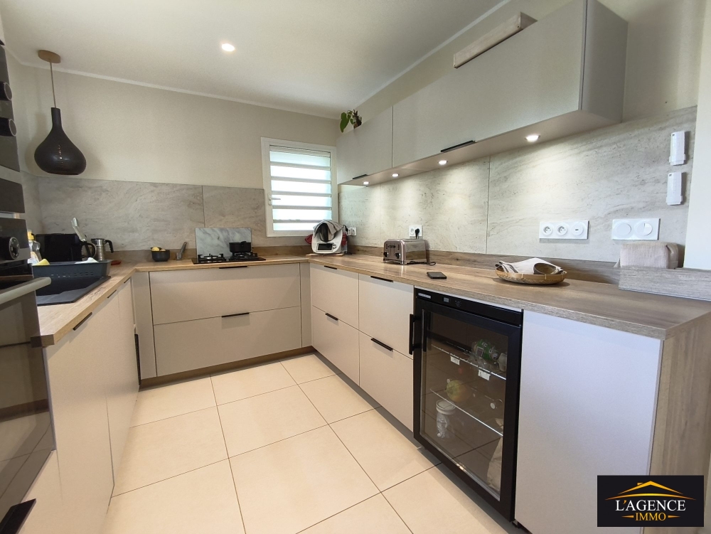 Très lumineuse et sans vis-à-vis, elle se compose d'une cuisine moderne équipée, ouverte sur un bel espace de vie avec accès direct à un deck en bois, idéal pour les moments de détente. Le séjour bénéficie de placards intégrés et s'ouvre sur une agréable terrasse côté piscine.