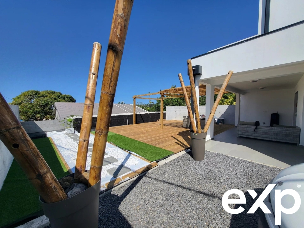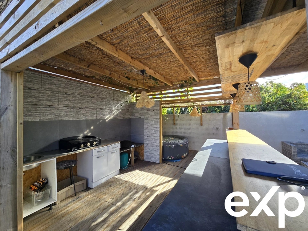 La terrasse couverte offre un espace de vie supplémentaire, parfait pour les moments de détente.