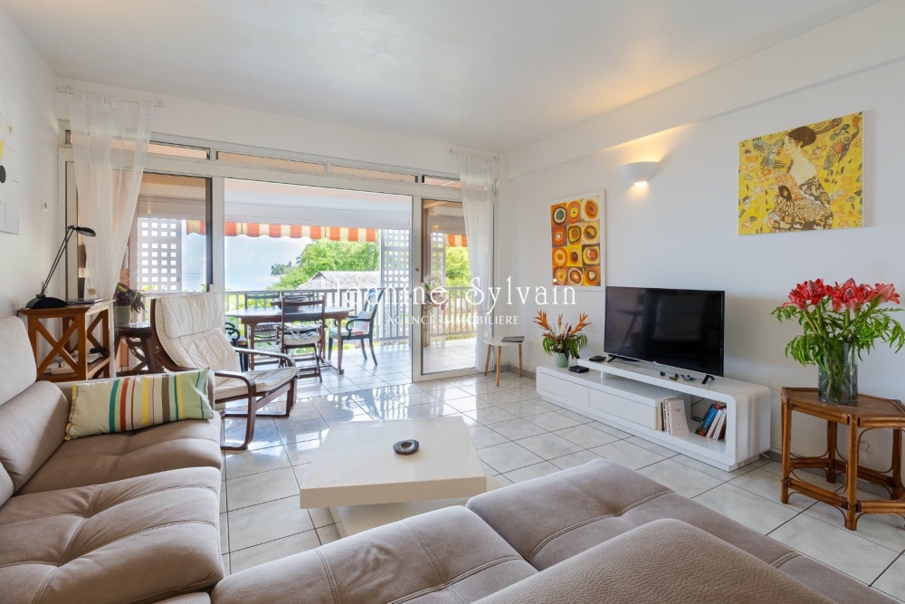 Jolie appartement de type F3 au 1e étage, comprenant 2 chambres dont une climatisée avec rangement, une salle d'eau, un salon, une cuisine entièrement équipée, une belle terrasse couverte donnant sur la vue Moorea.