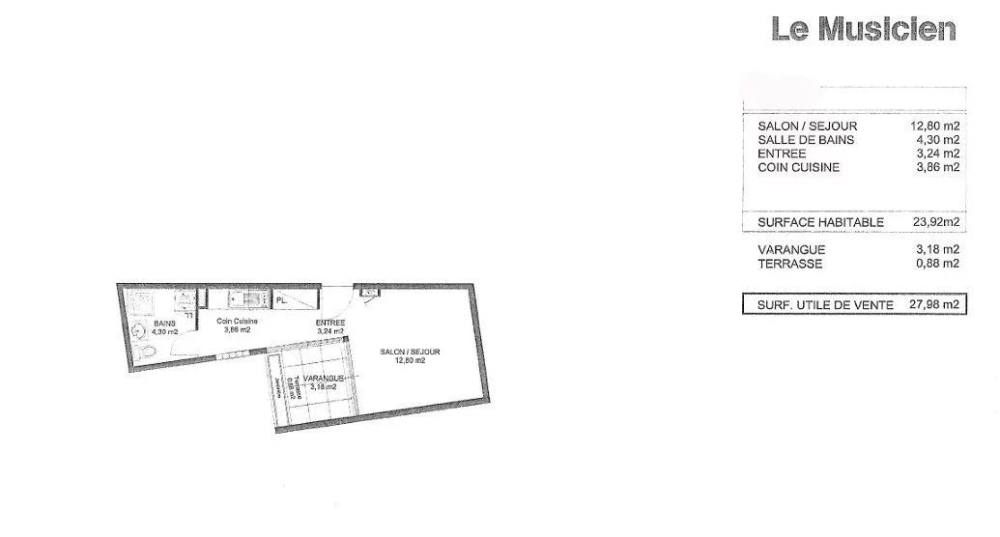 SAINT-DENIS / STUDIO 24 m2 / RESIDENCE LE MUSICIEN / VENDU AVEC LOCATAIRE BAISSE DE PRIX ! EXCLUSIVITE : Studio situé au 3 ème étage, Composé de : 1 séjour : 12.80 m2 1 coin cuisine : 3.86 m2 1 salle de bains : 4.30 m2 1 entrée: 3.24 m2 1 varangue : 4 m2 1 emplacement de parking en sous-sol Loyer : 375 €+ 25 € de provision de charges fin de bail Mai 2027 Taxe foncière : 869 € dont 240 € de TEOM