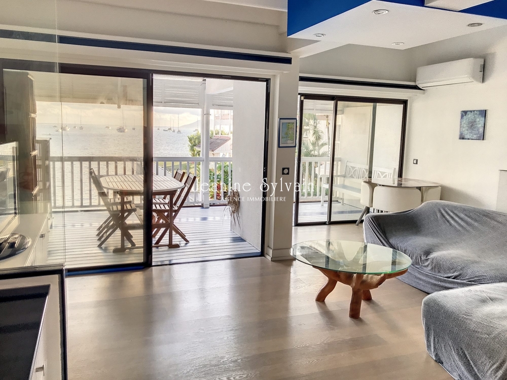 Dans une petite copropriété les pieds dans l'eau, avec ammarage bateau privatif donnant accès direct au lagon, appartement F3 duplex comprenant en bas 1 chambre climatisée avec dressing et une salle d'eau, 1 wc indépendant, cuisine équipée, séjour climatisé, grande terrasse couverte face au lagon.