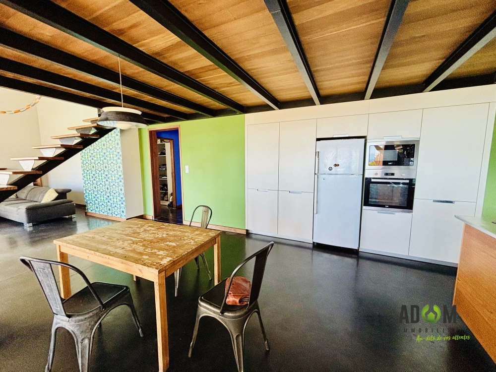 Ouvert sur l'extérieur grâce à ses larges baies, le vaste salon séjour avec plafond cathédrale vous offre, une vue plongeante sur l'océan. Il se prolonge par une cuisine spacieuse et fonctionnelle pensée pour cuisiner, partager et recevoir en toute simplicité.