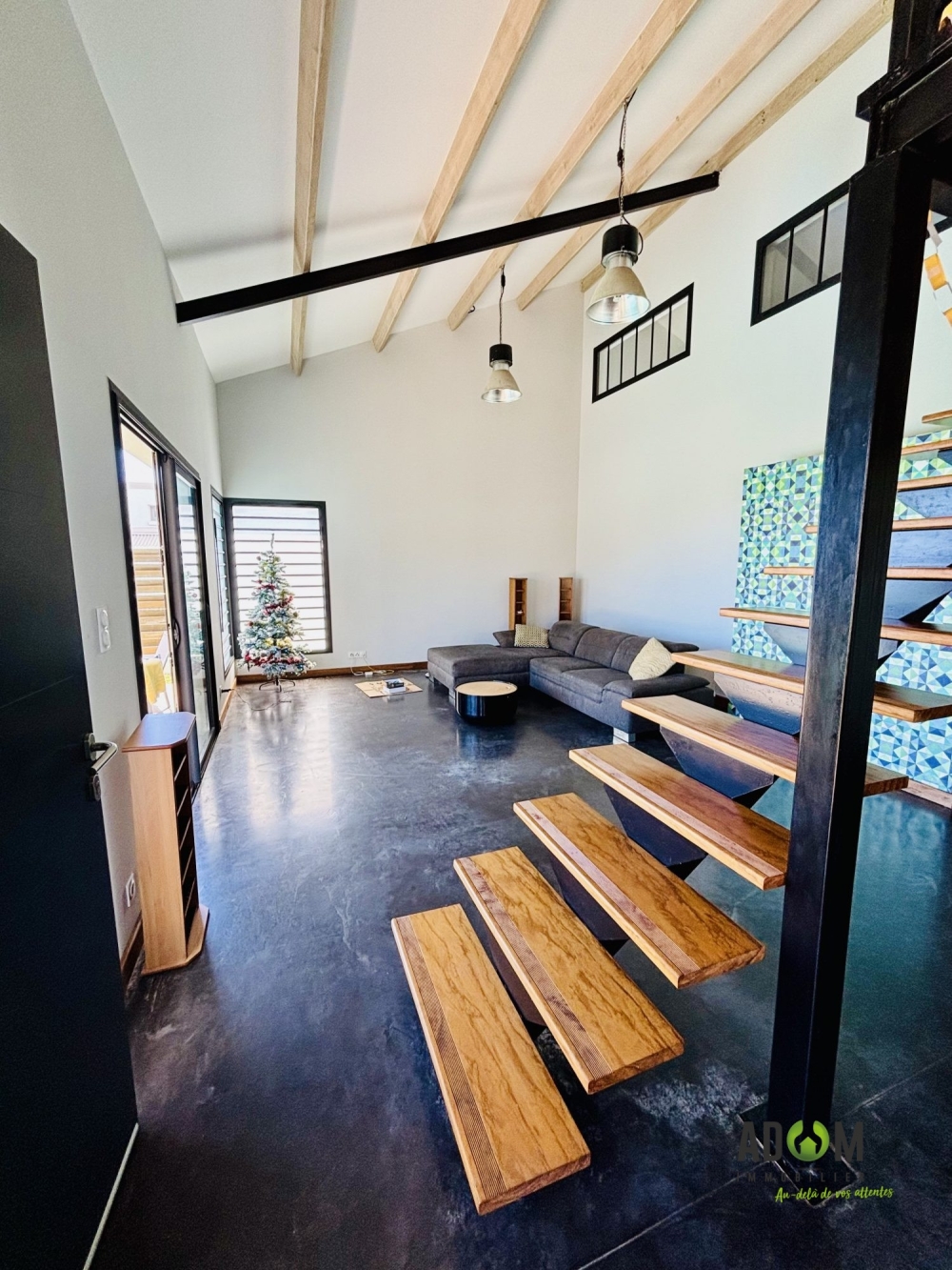 Des l'entrée, la pièce de vie capte l'attention pas ses volumes généreux et son esprit design.
