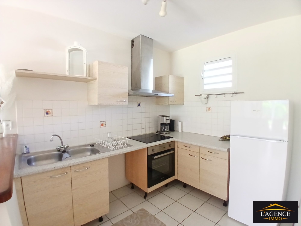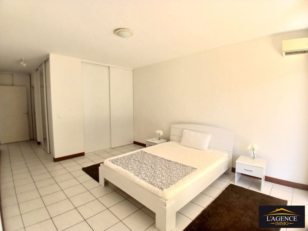 Dans une résidence calme et sécurisée, appartement F3 en rez-de-jardin d'une superficie d'environ 84m² composée d'une entrée, d'une cuisine équipée et aménagée, d'un lumineux séjour, d'une chambre climatisée avec placard, d'une salle d'eau avec WC, d'une seconde chambre climatisée avec double placards, salle d'eau et WC et d'une terrasse couverte donnant sur un petit jardin.