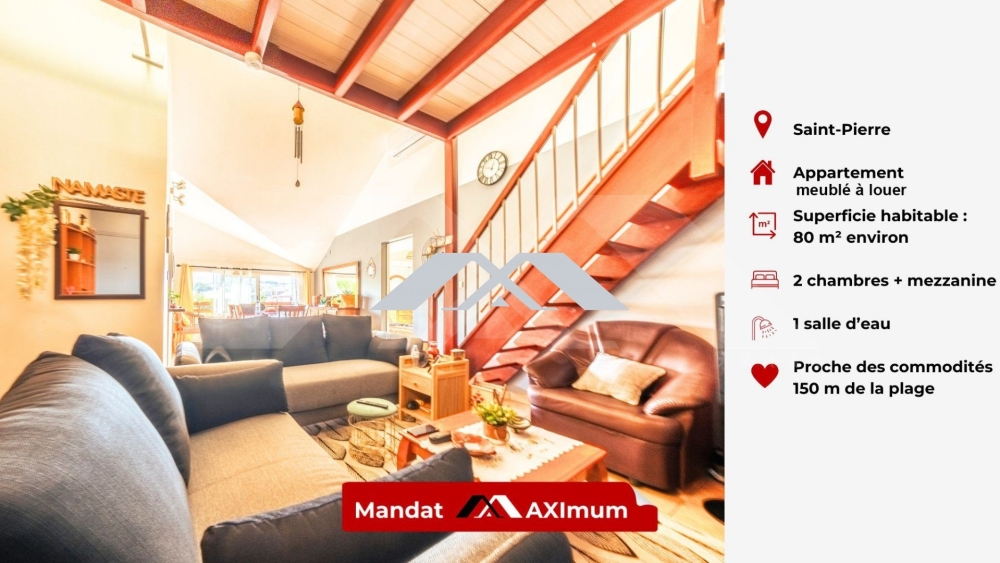 MAXImmo vous propose ce splendide appartement T3 d'environ 80 m² habitable, situé dans une belle résidence édifiée à seulement 150 m de la superbe plage de Saint Pierre, capitale du sud de l'île.
