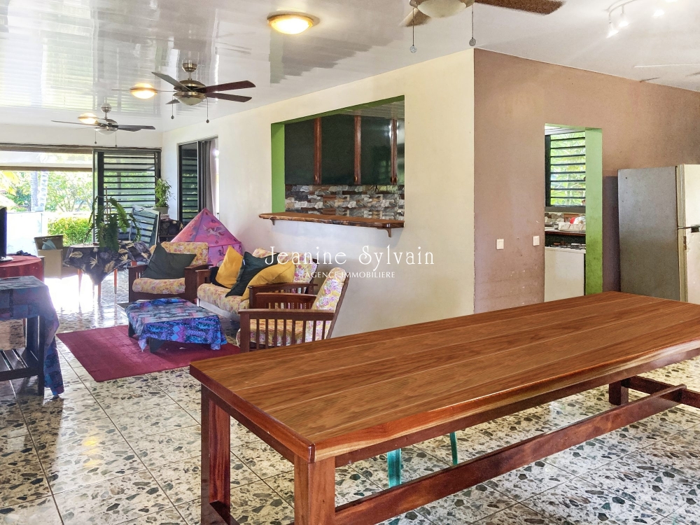 A Maatea, à 15min du quai de Vaiare, en bord de mer devant une magnifique plage de sable blanc et beau lagon, une grande propriété de 3250 m² entièrement plate et clôturée avec une grande maison sur pilotis de 280m2 comprenant 5 chambres, un salon, une cuisine équipée, 2 salles d'eau. 1 bungalow indépendant avec salle d'eau et 2 grand espaces garage couvert.