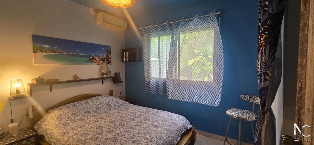 Située au pied du Mont-Mou, sur un terrain plat et clos de 5 ares, villa traditionnelle F3 offrant : séjour, cuisine ouverte aménagée, 2 chambres climatisées avec placard, salle d'eau, wc, buanderie. En extérieur, une terrasse couverte de 20 m² prolonge le séjour et une véranda de 25 m² donne accès au deck de 35 m² entourant la piscine.