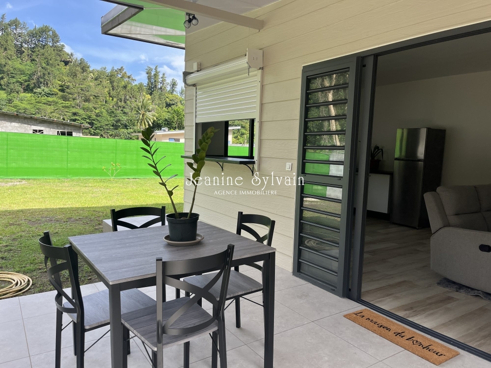 Au calme, dans un environnement verdoyant, une maison neuve de 45m2 habitable comprenant un salon, une cuisine équipée, une chambre, une salle d'eau. Une terrasse couverte de 15m2 et un garage couvert avec coin buanderie. Jardin entretenu et clôturé. Portail manuel.