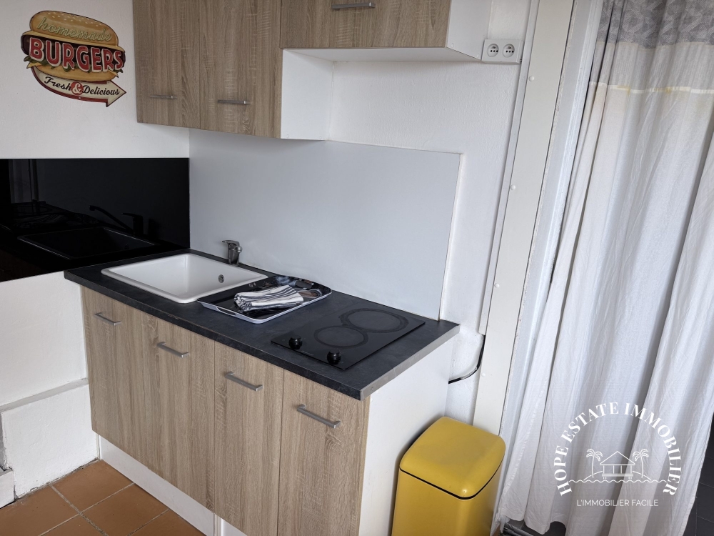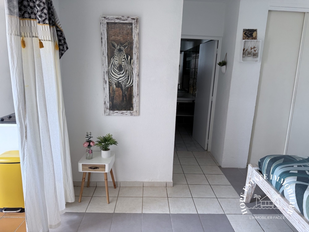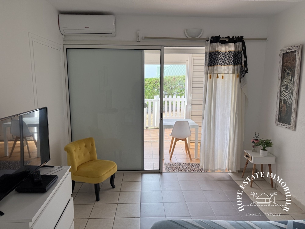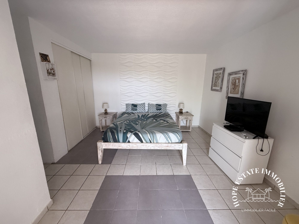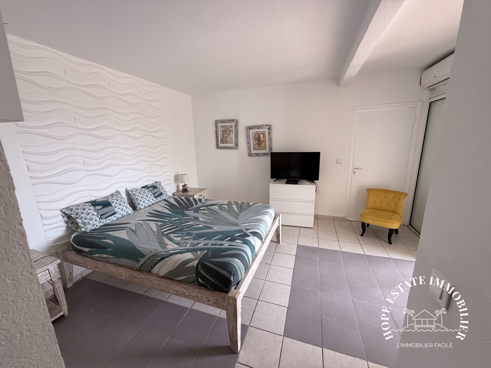 Charmant studio, vue mer, dans une résidence close parking extérieur, au RDC d'une villa, avec jardin de 2000 m2, paysagé, pour deux personnes, parfaitement aménagé, avec cuisine sur terrasse fermée, frigo congélateur, plaque de cuisson, micro onde, toute la vaisselle nécessaire, chambre avec lit en 160, téléviseur, avec chaines internationales, connexion wifi sans fil, grande salle d'eau avec douche, rangements, machine à laver le linge, avec étendoir sur terrasse, fer à repasser, table à repasser,