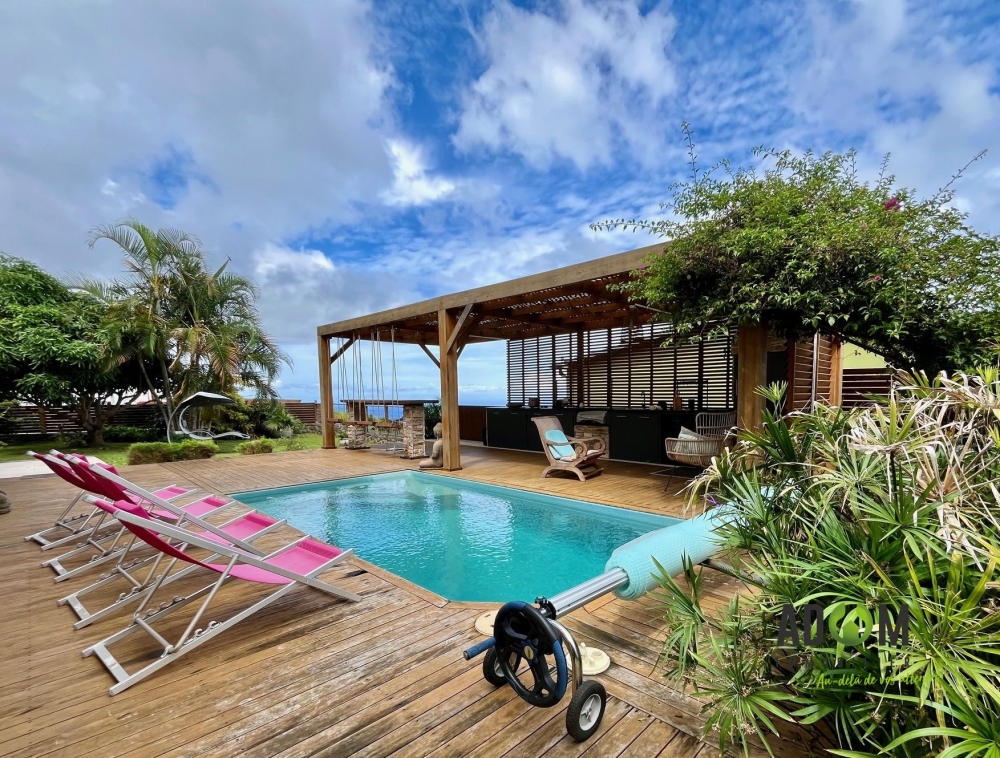 À l'extérieur, profitez d'un jardin soigné avec piscine, d'un deck en bois et d'une terrasse conviviale avec sa cuisine extérieur, parfaits pour les moments de détente ou les réceptions entre amis, le tout avec une vue la mer.