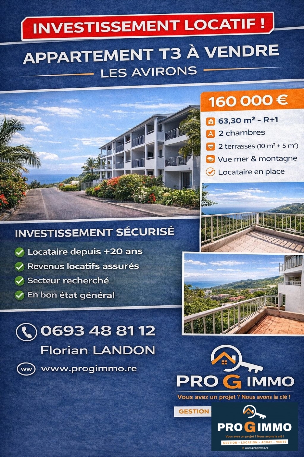 Situé au sein d'un immeuble bien placé aux Avirons, cet appartement T3 en R+1 offre un cadre de vie agréable avec une double vue dégagée et un locataire en place, idéal pour un investissement serein.