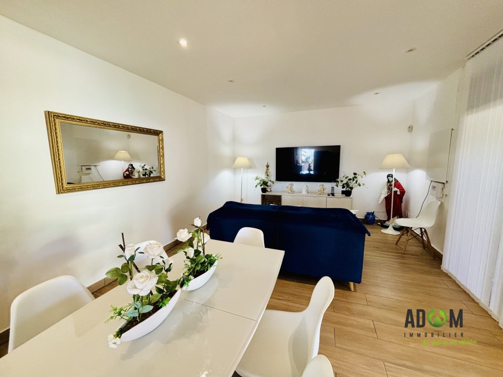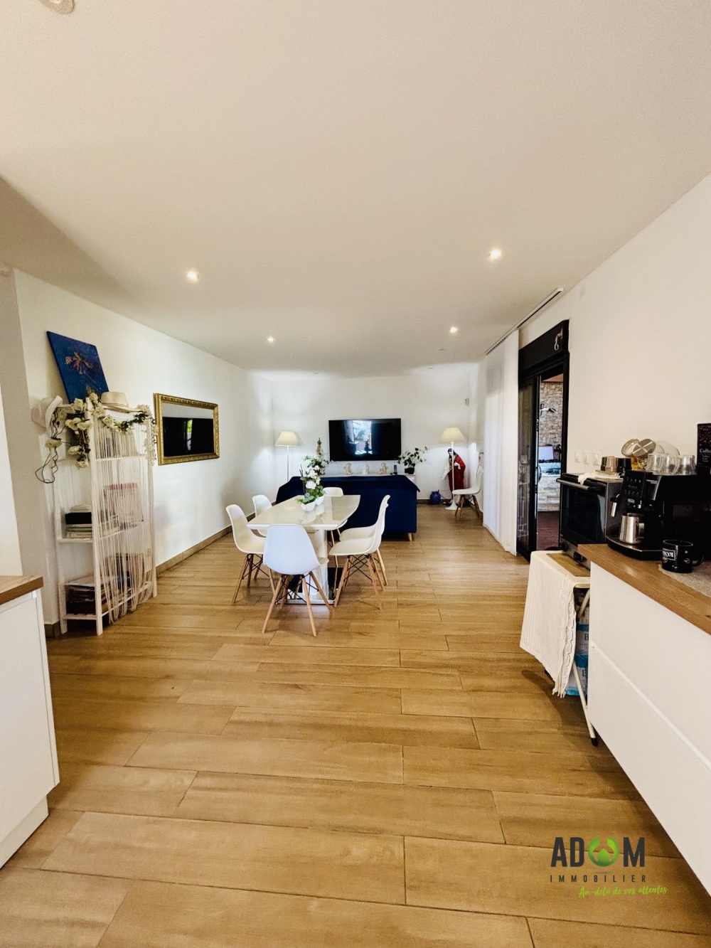 Imaginez-vous dans un séjour spacieux, baigné de lumière grâce à ses grandes ouvertures en aluminium, offrant une vue sur le jardin et la piscine.
