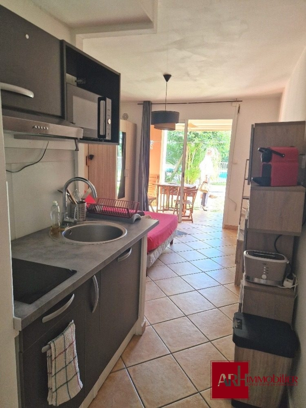 T1 MEUBLE LOCATION LONGUE DUREE EN RESIDENCE PRINCIPALE, climatisé, d'une surface de 25 m² avec varangue, comprenant une entrée avec kitchenette, une pièce de vie ouverte sur varangue avec belle vue sur la piscine, une salle d'eau avec wc, une cave privative, une place de parking aérienne.