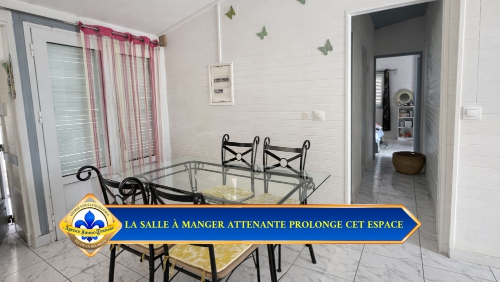 SÉJOUR OUVERT SUR LA VARANGUE : Le séjour lumineux s'ouvre directement sur l'extérieur, créant une CIRCULATION FLUIDE entre intérieur et varangue. Un espace convivial pensé pour la vie quotidienne.