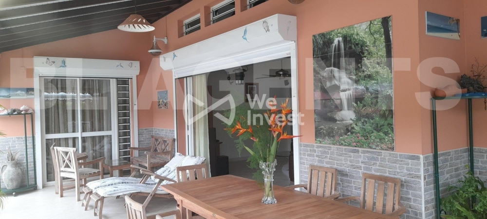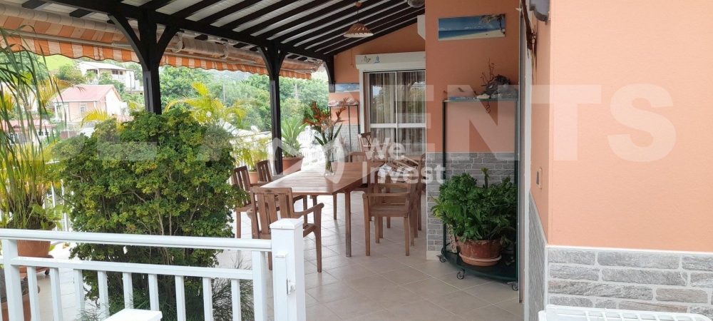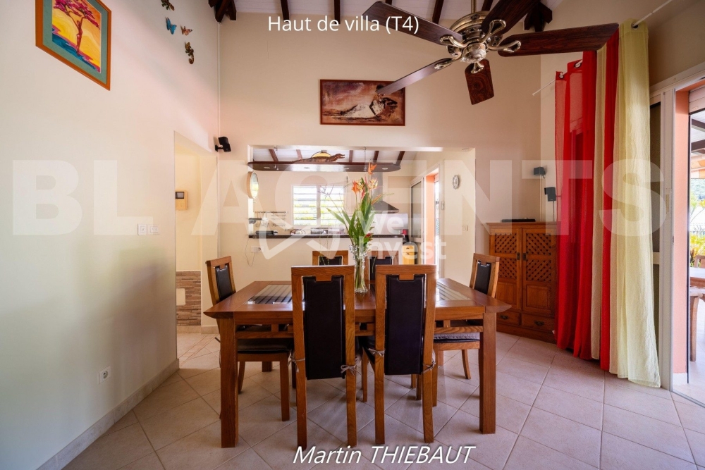Très bel emplacement sur les hauteurs du MARIN, proche de toutes les commodités commerciales, nautiques, éducatives dans un rayon de 600 à 2000 mètres, située au coeur d'un lotissement paisible et non traversant, cette villa de construction traditionnelle tout en charpente de bois rouge angélique, allie charme authentique et modernité. Erigée sur un terrain clôturé de 663m2, gazonné et arboré, cette propriété offre un cadre de vie serein et verdoyant. Elle se compose de 2 logements indépendants idéaux pour une grande famille ou pour un projet locatif voire saisonnier immédiatement exploitable. Vendue meublée et équipée. Aucun travaux à prévoir. Terrain plat piscinable Caractéristiques principales : Haut de villa : Un T4 de 150 m2 comprenant : · une terrasse de 46m2 avec aperçu mer et vue dégagée sur un morne verdoyant, · 1 cuisine américaine aménagée avec cellier ouverte sur la terrasse, · 1 grand salon/salle à manger ventilé avec plafond cathédrale ouvert sur 3,50m sur la terrasse par des baies coulissantes à galandage, · 1 suite parentale climatisée composée d'une chambre, d'un double dressing, d'une salle de bain avec meuble double vasques, baignoire et WC, · 2 chambres climatisées avec placard mural panneaux coulissants, · 1 salle d'eau comprenant une douche italienne, un WC et un meuble simple vasque, · 1 local WC avec lave mains Bas de Villa : Un T3 de 66 m2 avec entrée totalement indépendante comprenant : · 1 terrasse ventilée de 19m2 donnant sur un petit jardin tropical, · 1 cuisine américaine aménagée, · 1 salle de séjour ventilée ouverte sur 2,60m sur la terrasse par des baies coulissantes à galandage · 2 chambres décorées climatisées et ventilées dont une est équipée d'un grand placard mural, · 1 salle d'eau avec douche italienne, WC et meuble simple vasque de salle de bain, Aménagements extérieurs : · 1 carbet avec - Au niveau RDC un grand spa jacuzzi 6 places avec un carré douche extérieure eau chaude froide sans vis-à-vis - Au niveau RDC-1 un local avec lavabo abritant une citerne de récupération eau de pluie de 3300 litres · 1 espace barbecue avec lavabo jouxtant la pelouse Elle comprend en outre en RDC-1, 2 garages fermés et un emplacement bétonné pour véhicule. Atouts écologiques : · Chauffe-eau solaire 200 litres · 14 panneaux solaires avec 3 batteries de stockage · Une borne de recharge électrique WALLBOX pour véhicules, · 1 cuve de récupération eau de pluie de 3300L. Renseignements complémentaires : Classée DPE A – tout à l'égout – conformité assainissement.