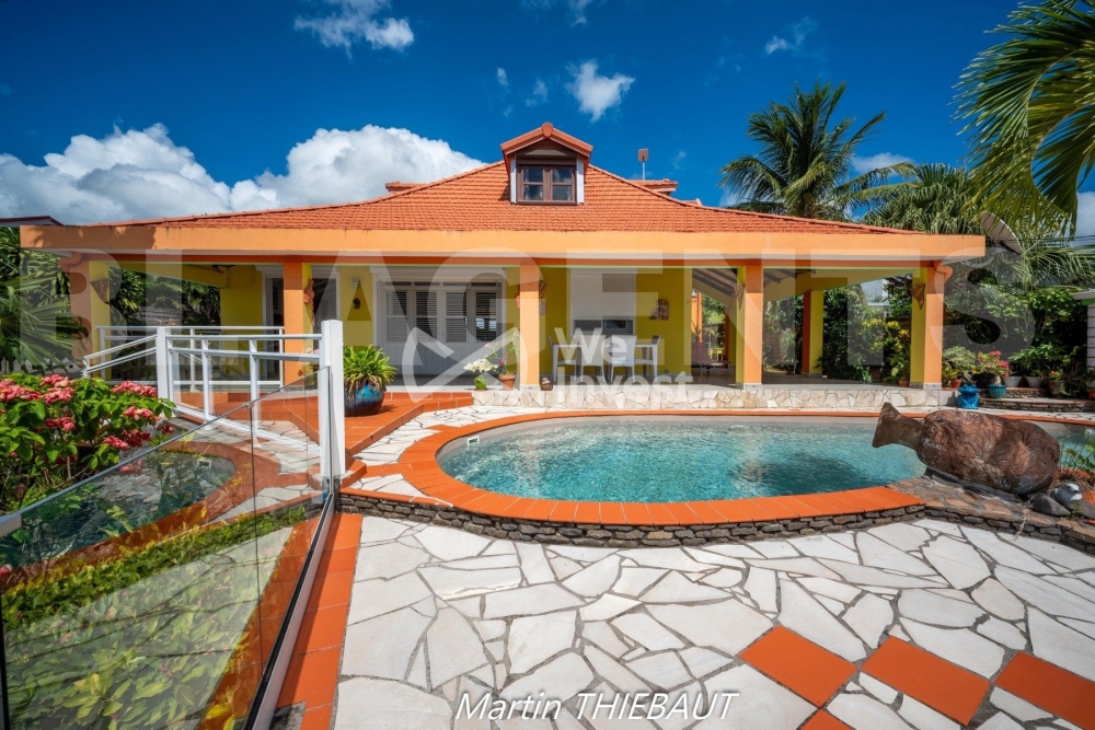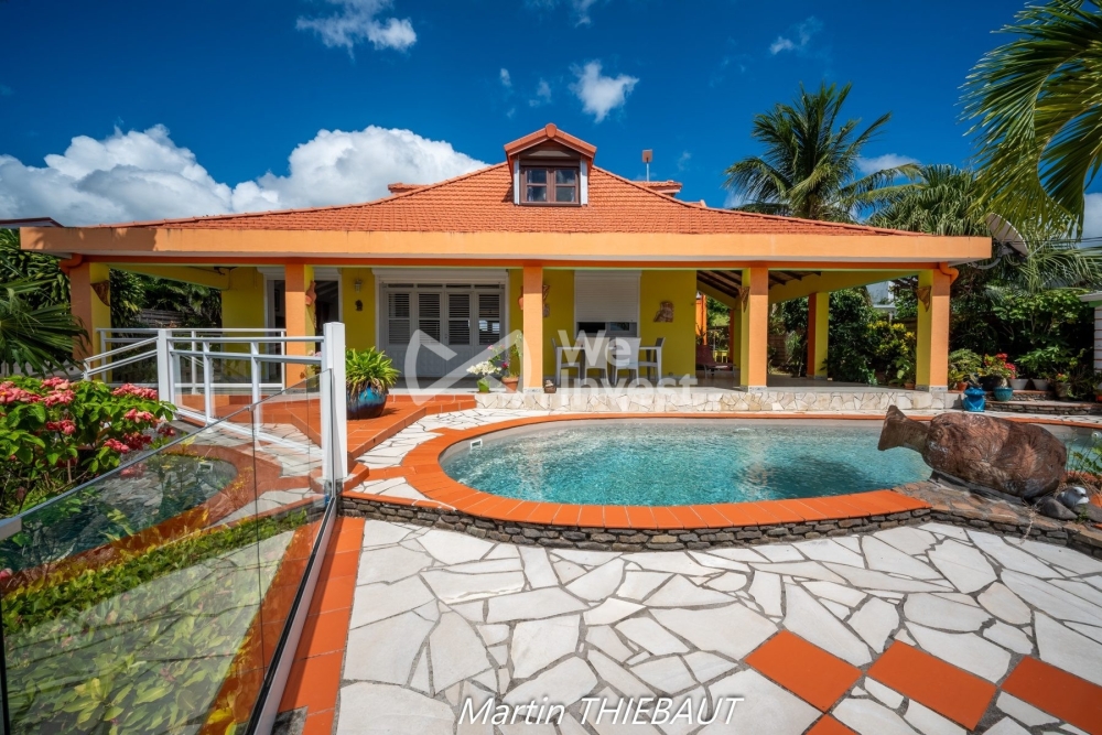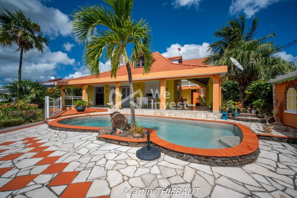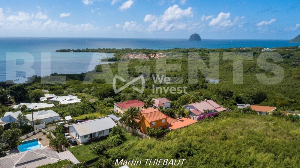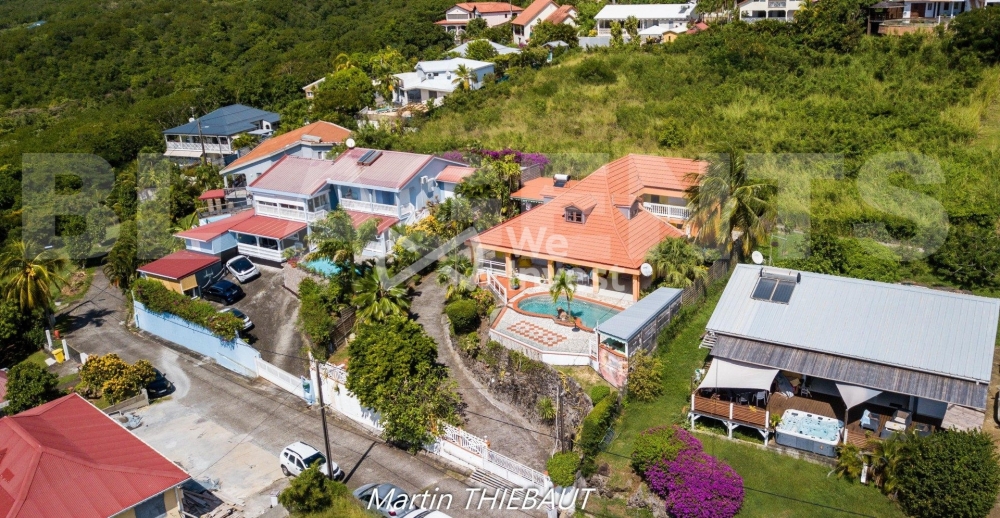 Située au Diamant, cette villa de 165 m², répartie sur deux niveaux, est implantée sur un terrain de près de 800 m², au sein d'un lotissement calme et ventilé. Le rez-de-chaussée propose un séjour avec cuisine ouverte de 55 m², lumineux et agréable à vivre. La cuisine et le séjour donnent sur une grande terrasse couverte, offrant une magnifique vue mer, avec en point de mire le Rocher du Diamant. Dans le prolongement, une terrasse avec piscine complète harmonieusement les espaces extérieurs. À ce même niveau, la villa dispose de trois studios indépendants, chacun équipé de sa salle d'eau et de sa kitchenette extérieure, offrant une vraie autonomie pour l'accueil de la famille, des invités ou un usage locatif. Le rez-de-chaussée comprend également un grand garage d'environ 80 m², permettant de nombreuses possibilités de stationnement et de rangement. Un local technique pour la piscine, ainsi qu'un espace barbecue avec douche, complètent les équipements de ce niveau. À l'étage, l'espace nuit se compose de deux suites parentales, l'une avec salle d'eau, l'autre avec salle de bain. Les deux suites sont séparées par une terrasse couverte, apportant une réelle indépendance et davantage d'intimité à chaque chambre. L'ensemble offre une configuration fonctionnelle, de beaux volumes et un cadre de vie recherché, dans un secteur apprécié du Diamant. Un cadre de vie agréable, à découvrir pour en mesurer tout le potentiel.