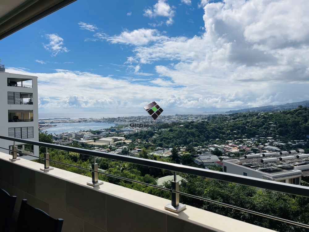 La terrasse couverte de 14 m2 offre une vue sur la rade de Papeete.