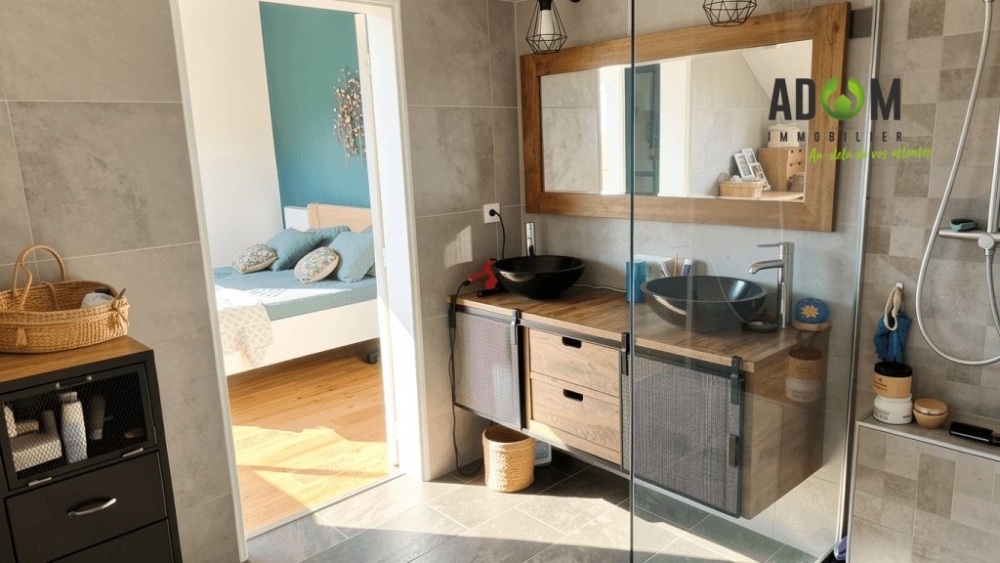 À l'étage, trois chambres dont une suite parentale, une salle d'eau et un WC indépendant composent un espace nuit intime et apaisant.