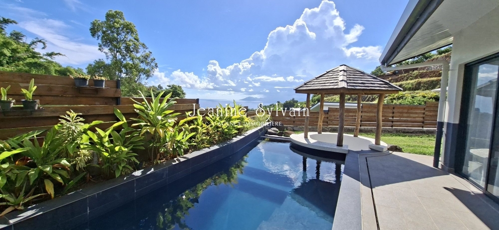 Profitez d'une jolie terrasse couverte donnant sur une piscine au sel et son fare potee intégré avec coin bar comme à l'hôtel pour partager de très bons moments en famille ou entre amis et d'un joli coin jardin.