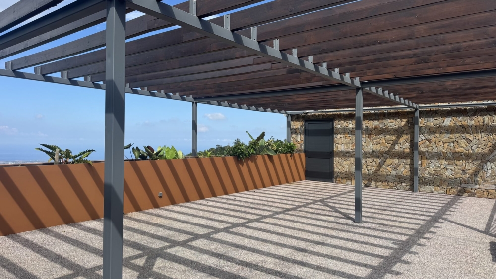 Une grande varangue courant le long du logement et élargie au niveau de la pièce de vie