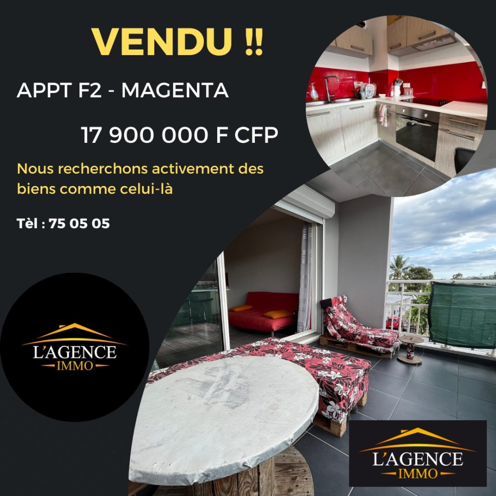 Notre agence est actuellement à la recherche de biens immobiliers à mettre en vente. Ce bel appartement F2 situé à Magenta que nous avions précédemment proposé est actuellement vendu. Si vous êtes propriétaire d'une bien que vous souhaitez vendre ou si vous connaissez quelqu'un qui envisage de mettre son bien sur le marché, n'hésitez pas à nous contacter. Estimation gratuite - rendez-vous au 79 72 72