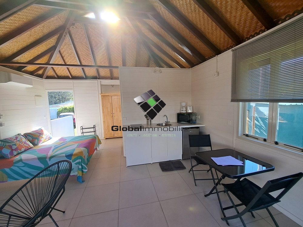 Nous vous proposons à la location, début PAEA, dans un havre de paix, Bungalow, Coté mer, avec accés direct à la plage, équipé, meublé, 1 pièce, terrasse couverte, salle d'eau avec toilette, jardin,.