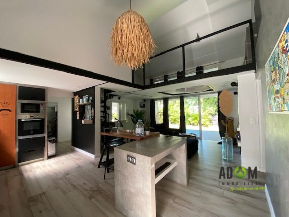 - Salon : Espace salon très lumineux avec une belle hauteur sous plafond, accès direct à une grande varangue en L de 64 m² couverte