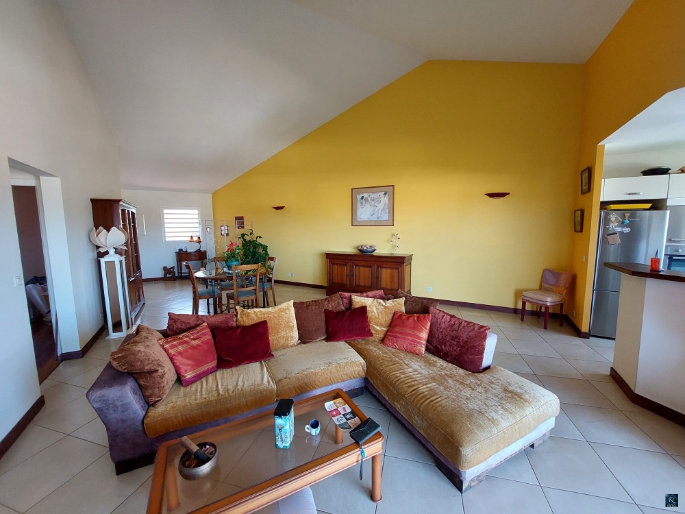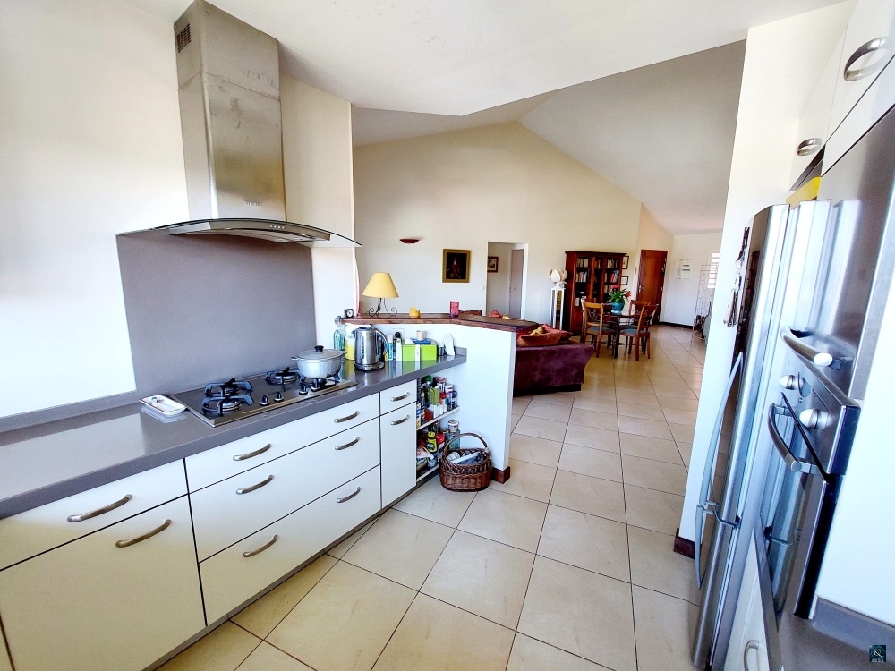 Une cuisine entièrement équipée donnant sur un salon/salle à manger très lumineux d'une superficie de 48 m² et une hauteur sous plafond de plus de 4m qui donne à cet appartement un charme fou.