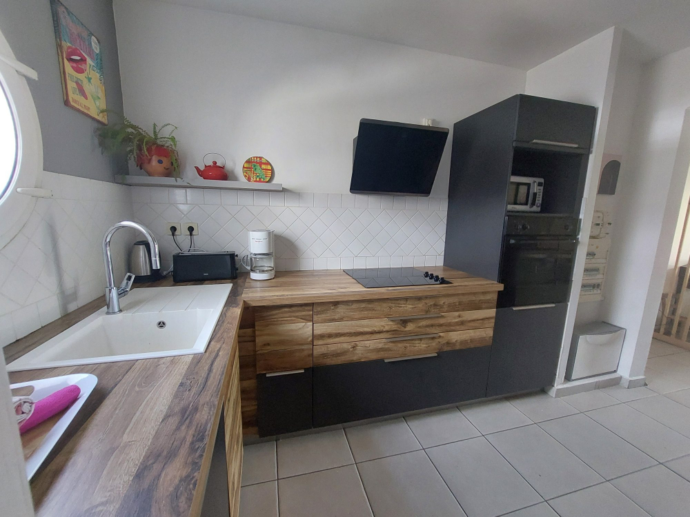 Un séjour, une jolie cuisine entièrement aménagée, un cellier, deux chambres climatisées avec placard de rangement, une salle d'eau avec WC et une terrasse prolongée par un Deck donnant sur un jardin de 75.50 m².