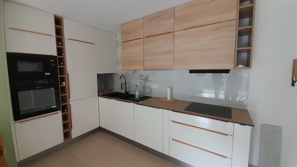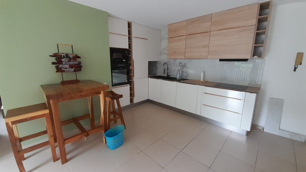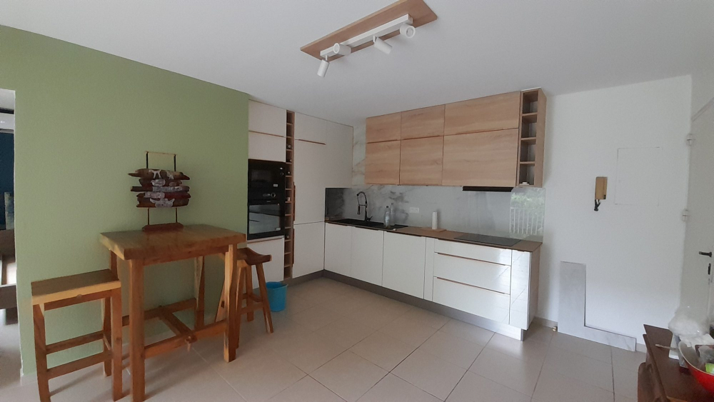 Une chambre climatisée, une cuisine aménagée et équipée, une salle d'eau avec wc, un salon