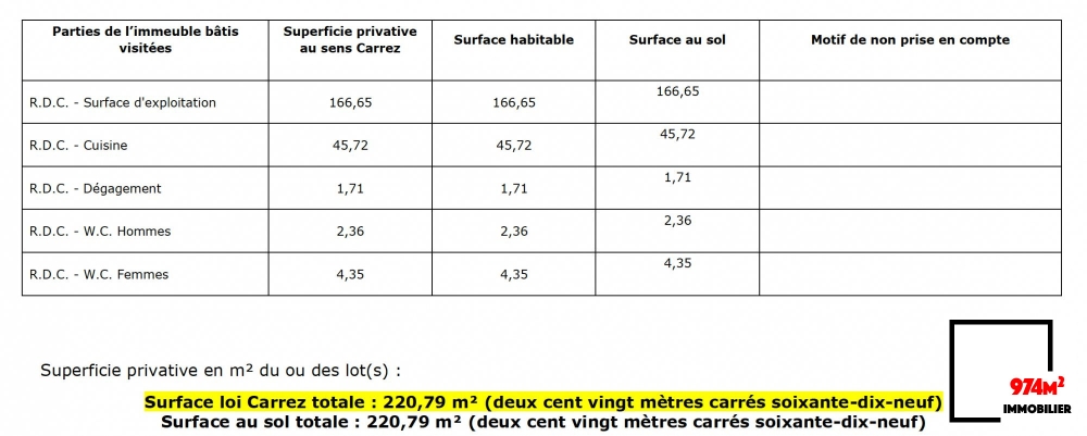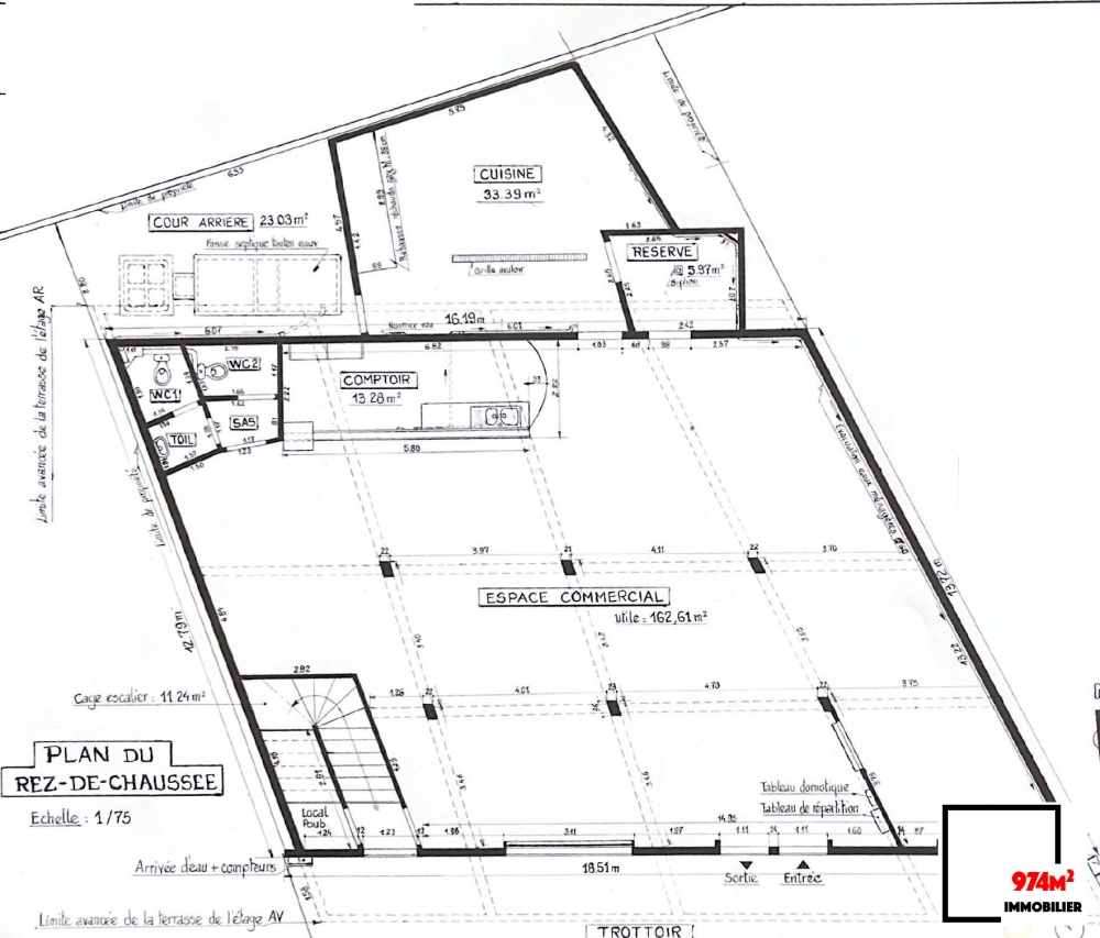 -RDC(220m2): 1 local de 166m2m2 (3 entrées et 1 vitrine) avec une cuisine, sanitaire et une coursive