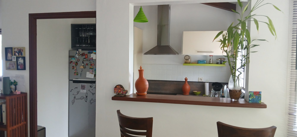 La cuisine aménagée et équipée donne sur un spacieux séjour / salon de 38 m2 face à la végétation,ce qui lui procure un silence absolu en osmose avec le chant des oiseaux.